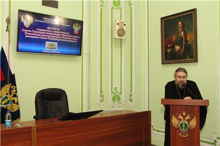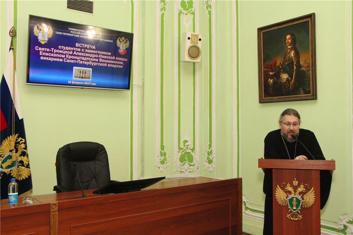 28 февраля 2025 г. в Санкт-Петербургском филиале Университета прокуратуры Российской Федерации состоялась встреча студентов юридического факультета с Епископом Кронштадтским Вениамином наместником Свято-Троицкой Александро-Невской лавры, викарием Санкт-Петербургской епархии.