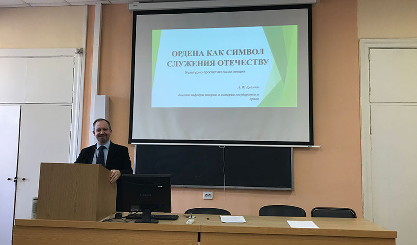 02 апреля 2025 г. в Санкт-Петербургском филиале Университета прокуратуры Российской Федерации доцентом кафедры теории и истории государства и права А.В. Ерёминым была проведена культурно-просветительная лекция «Ордена как символ служению Отечеству» для студентов 1 курса юридического факультета. В рамках лекции студенты ознакомились с историей развития наградной системы России и её состоянием в настоящее время.