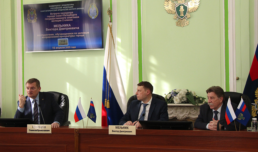 16 апреля 2025 г. в Санкт-Петербургском филиале Университета прокуратуры Российской Федерации состоялась встреча прокурора Санкт-Петербурга государственного советника юстиции 2 класса Мельника Виктора Дмитриевича со студентами юридического факультета Института, проходящими обучение по целевым направлениям прокуратуры Санкт-Петербурга. Во встрече приняли участие и.о. директора института Сальников Алексей Валентинович, начальник отдела кадров прокуратуры Алексеева Юлиана Борисовна, заместитель генерального директора Российской национальной библиотеки Голубцов Станислав Брониславович и декан юридического факультета Севастьяник Ирина Клавдиевна. В ходе встречи Мельник В.Д. рассказал об основных направлениях работы прокуратуры на современном этапе и результатах этой работы. Студентка 3 курса Бисултанова Милана рассказала, как проходила практику в одной из районных прокуратур города. |