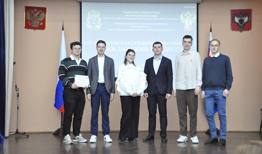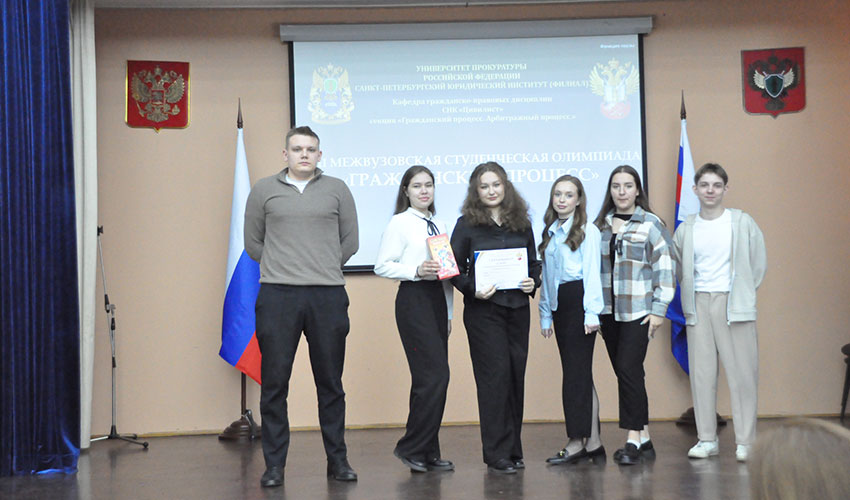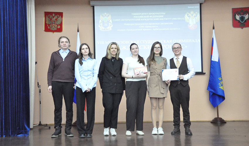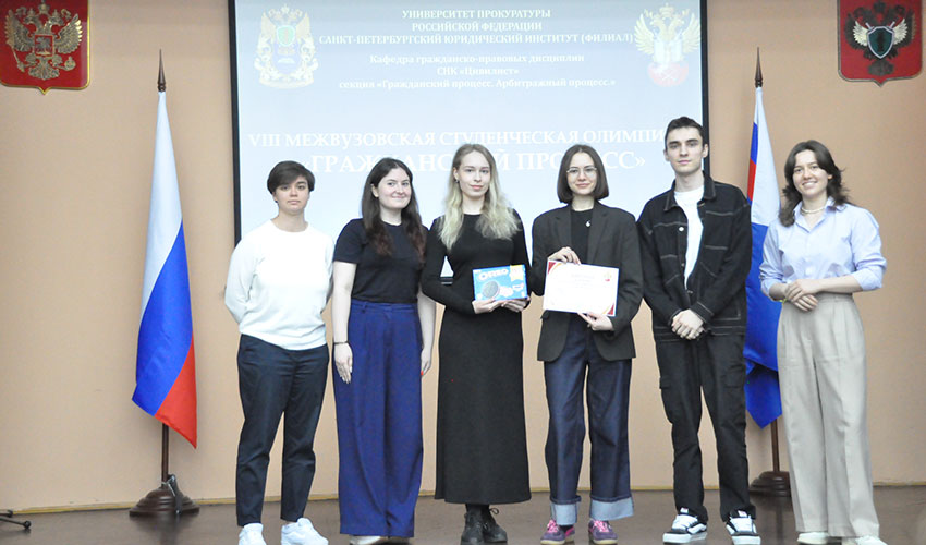 19 апреля 2025 г. в Санкт-Петербургском филиале Университета прокуратуры Российской Федерации состоялась VIII Межвузовская студенческая олимпиада «Гражданский процесс». В Олимпиаде приняли участие студенты Санкт-Петербургского института (филиала) Всероссийского государственного университета юстиции (РПА Минюста России), Санкт-Петербургского государственного экономического университета, Санкт-Петербургского государственного университета аэрокомического приборостроения, Санкт-Петербургской академии Следственного комитета Российской Федерации и Института. В состав жюри вошли: председатель жюри – заведующий кафедрой гражданско-правовых дисциплин Института, Васильчикова Н.А.; доценты кафедры Порохов М.Ю. и Пиддубривная А.Ю.; доцент кафедры гражданского процесса Санкт-Петербургского института (филиала) ВГУЮ (РПА Минюста России) Кузбагарова В.А.;. декан факультета повышения квалификации Санкт-Петербургской академии Следственного комитета Российской Федерации Розовская Т.И.; старший преподаватель кафедры гражданского и корпоративного права Санкт-Петербургского государственного экономического университета Калис М.Н. Олимпиада состояла из трех этапов: «Приветствие», «Тестирование» и «Решение кроссворда». Подводя итоги Олимпиады, жюри вынесло следующее решение: I место – команда «Наивные печеньки» Санкт-Петербургского юридического института (филиала) Университета прокуратуры Российской Федерации в составе: Кузнецовой Е., Вдовиченко И., Плешанова Д., Зинченко К., Григорьевой А., Войлокова В. II место – команда «Шалости Фемиды» Санкт-Петербургского государственного университета аэрокомического приборостроения в составе: Макарова А., Мензатовой М., Ермолаева А., Шленкова А., Неруш А., Ледовской А. III место – команда «ВАТКА» Санкт-Петербургского института (филиала) Всероссийского государственного университета юстиции (РПА Минюста России) в составе: Устенко В., Валовой А., Журавлевой К., Зениной П., Сухорукова А., Негановой А. Поздравляем победителей и призеров, а также благодарим участников за проявленный интерес и активное участие в Олимпиаде! |