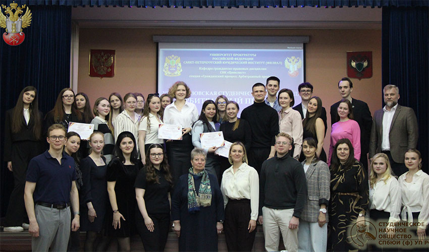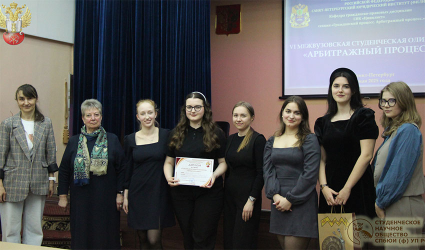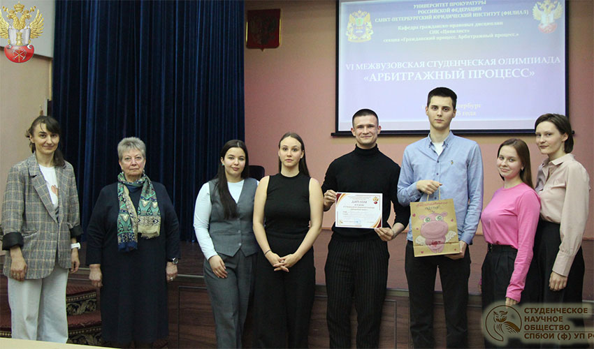 17 мая 2025 г. в Санкт-Петербургском филиале Университета прокуратуры Российской Федерации состоялась VI Межвузовская студенческая олимпиада «Арбитражный процесс». В Олимпиаде приняли участие студенты Санкт-Петербургского института (филиала) Всероссийского государственного университета юстиции (РПА Минюста России), Санкт-Петербургского государственного университета аэрокосмического приборостроения и Института. В состав жюри вошли заведующий кафедрой гражданско-правовых дисциплин Института Васильчикова Н.А. (председатель), доценты кафедры Порохов М.Ю. и Пиддубривная А.Ю., старший преподаватель кафедры Тарасевич К.А., доцент кафедры гражданского процесса Санкт-Петербургского института (филиала) ВГУЮ (РПА Минюста России), Кузбагарова В.А. Олимпиада состояла из трех этапов: Первый этап – приветствие, в котором командам нужно было представить команды в формате видео-ролика. Второй этап – тестирование, которое представляло собой перечень и вопросов с вариантами ответов на них. Третий этап – решение кроссворда. Подводя итоги Олимпиады, жюри вынесло следующее решение: I место – команда «Нет нам покоя» Санкт-Петербургского филиала Университета прокуратуры Российской Федерации (Власова Мария, Иванова Ксения, Ребковец Милана, Мурзина Валерия, Доценко Александра и Гладковская Анастасия). II место – команда «Юрик, ты банкрот» Санкт-Петербургского филиала Университета прокуратуры Российской Федерации (Бугаева Анастасия, Аверьянова Варвара, Афанасьев Евгений, Бажина Ульяна, Белова Виктория и Гуревич Даниил). III место разделили команда «Виват! Юстиция» Санкт-Петербургского института (филиала) Всероссийского государственного университета юстиции (РПА Минюста России) (Куликова Анастасия, Артеева Марина, Гнусарева Владлена, Едемская Анастасия, Ореханова Мария, Сидорова Виктория) и команда «Апелляционный аппетит» Санкт-Петербургского государственного университета аэрокосмического приборостроения (Кондратюк Владлена, Руденко Софья, Семенов Сергей, Сальникова Светлана, Шрамко Александра и Гельке Артур). Поздравляем победителей и призеров, а также благодарим участников за проявленный интерес и активное участие в Олимпиаде!