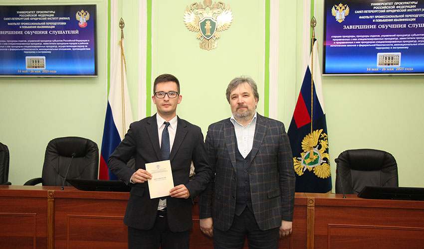 26 мая 2025 года в Санкт-Петербургском юридическом институте (филиале) Университета прокуратуры Российской Федерации завершилось обучение слушателей по программе повышения квалификации прокуроров, старших прокуроров отделов, управлений прокуратур субъектов Российской Федерации и приравненных к ним специализированных прокуратур, заместителей прокуроров городов, районов и приравненных к ним прокуроров специализированных прокуратур, осуществляющих надзор за исполнением законов о федеральной безопасности, межнациональных отношениях, противодействии терроризму и экстремизму. В результате повышения квалификации прокурорские работники систематизировали знания по вопросам деятельности и информационного обеспечения в органах прокуратуры; надзора за исполнением законов; актуальные вопросы участия прокурора в уголовном судопроизводстве. За период обучения слушатели посетили музей «Монумент героическим защитникам Ленинграда», объекты исторического и культурного наследия Санкт-Петербурга. |