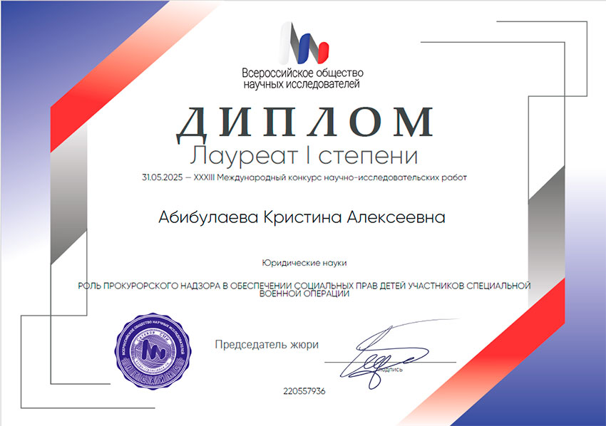 31 мая 2025 г. был проведен XXXIII Международный конкурс научно-исследовательских работ, организованный Всероссийским обществом научных исследователей ПТСайнс. Лауреатом I степени стала студентка юридического факультета Санкт-Петербургского филиала Университета прокуратуры Российской Федерации Абибулаева Кристина, с работой «Роль прокурорского надзора в обеспечении социальных прав детей участников специальной военной операции». Поздравляем победителя и желаем дальнейших научных достижений! |