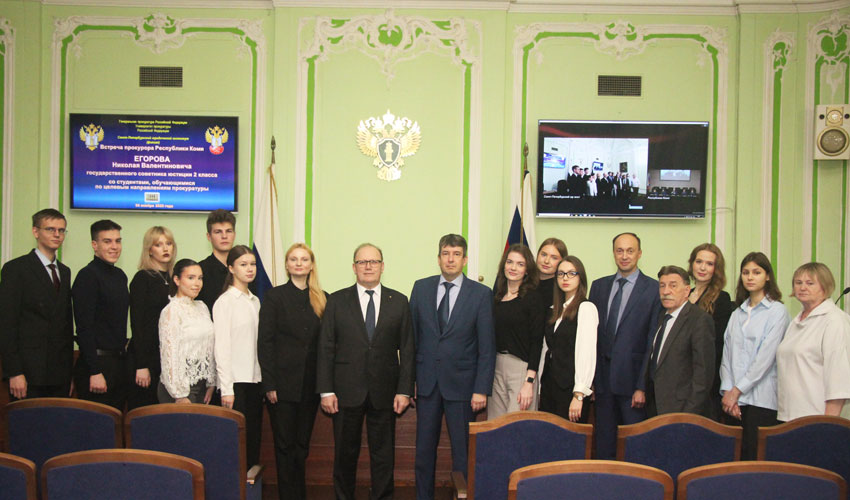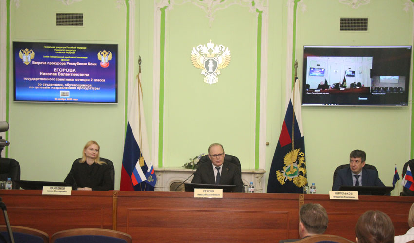 06 ноября 2025 г. в Санкт-Петербургском филиале Университета прокуратуры Российской Федерации состоялась встреча прокурора Республики Коми государственного советника юстиции 2 класса Егорова Николая Валентиновича со студентами юридического факультета Института, проходящими обучение по целевым направлениям от прокуратуры Республики Коми. Во встрече приняли участие директор Института старший советник юстиции Щепельков Владислав Федорович, заместитель директора института Сальников Алексей Валентинович, заместитель директора Шобухин Владимир Юрьевич, представитель Республики Коми в Северо-Западном регионе Науменко Алиса Викторовна и декан юридического факультета Севастьяник Ирина Клавдиевна. Прокурор Республики отметил, что встречи руководства прокуратуры и студентов, обучающихся в Институте по целевым направлениям, стало доброй традицией, что создает благоприятные условия для успешной деятельности выпускников в их дальнейшей службе, обратил внимание студентов на необходимость формирования профессиональных качеств будущих сотрудников, рассказал об основных направлениях работы прокуратуры на современном этапе и результатах этой работы. В ходе встречи напутственные слова для будущих прокуроров прозвучали от директора института Щепелькова Владислава Федоровича и представителя Республики Коми в Северо-Западном регионе Науменко Алисы Викторовны. Из студии в г. Сыктывкаре в формате ВКС во встрече приняли участие и.о. прокурора Республики Коми Нестеров Михаил Анатольевич, начальник отдела кадров Шустов Борис Алексеевич, начальник управления правовой статистики, информационных технологий и защиты информации прокуратуры Зайцева Евгения Петровна, старший помощник прокурора по рассмотрению обращений и приему граждан Швенглер Татьяна Николаевна и старший прокурор отдела кадров Апицина Анна Александровна. В завершении мероприятия с сообщениями о порядке работы с обращениями граждан и использования информационных технологий в прокурорской деятельности выступили Швенглер Т.Н. и Зайцева Е.П.