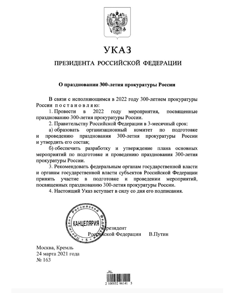 Указ Президента Российской Федерации "О праздновании 300-лети прокуратуры России"