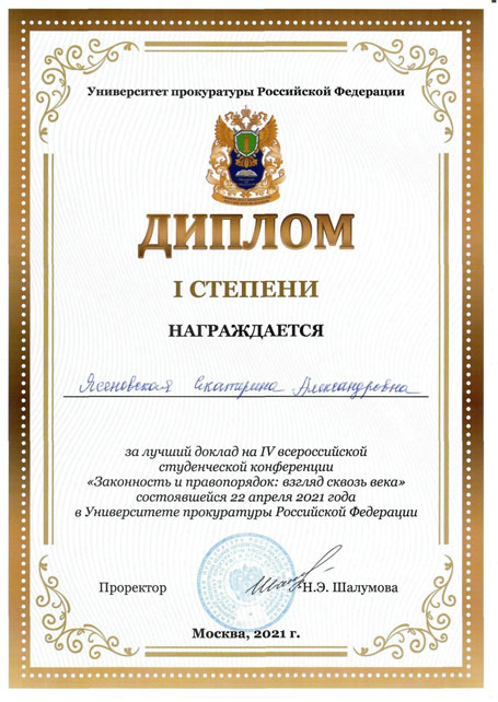 22 апреля 2021 года в Университете прокуратуры Российской Федерации в очно-дистанционном формате состоялась IV Всероссийская студенческая конференция "Законность и правопорядок: взгляд сквозь века". В работе конференции приняли участие более 112 человек, в том числе студенты Санкт-Петербургского юридического института (филиала) Университета прокуратуры Российской Федерации. По итогам Конференции студентка 1 курса юридического факультета Института Ясеновская Екатерина Александровна заняла 1 место.