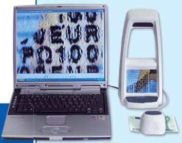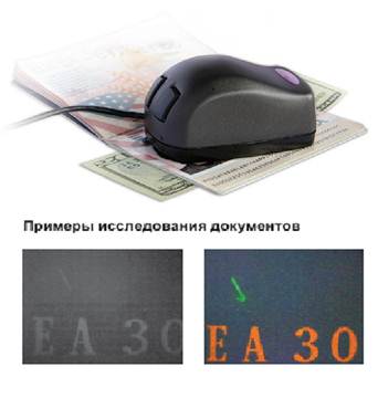 Б. Средства оптического увеличения — средства макро- и микроскопии. К средствам макроскопии относятся оптические и телевизионные лупы, позволяющие изучить мелкоразмерные слаборазличимые для глаза следы и объекты. Примером использования в судебном следствии простого в эксплуатации технического средства макроскопии является применение мультирежимных (многоспектральных) телевизионных луп БТП-1332(А), «Регула-4077» и «Регула-4177» с возможностью подключения к компьютеру (USB 2.0). Лупа БТП-1332(А) предназначена для проверки документов, банкнот и ценных бумаг на наличие и соответствие защитных признаков (рельеф, микропечать, особенности линий фоновых сеток и орнаментов, метамерность красителей, инфракрасная (ИК)-, ультрафиолетовая (УФ)- и АС-люминес-ценция фрагментов и волокон и др.) с визуализацией увеличенного изображения на экране монитора (рис. 1)(1). Лупа cпектральная люминесцентная «Регула-4177» позволяет получать изображения документов в инфракрасном и ультрафиолетовом спектрах(2).